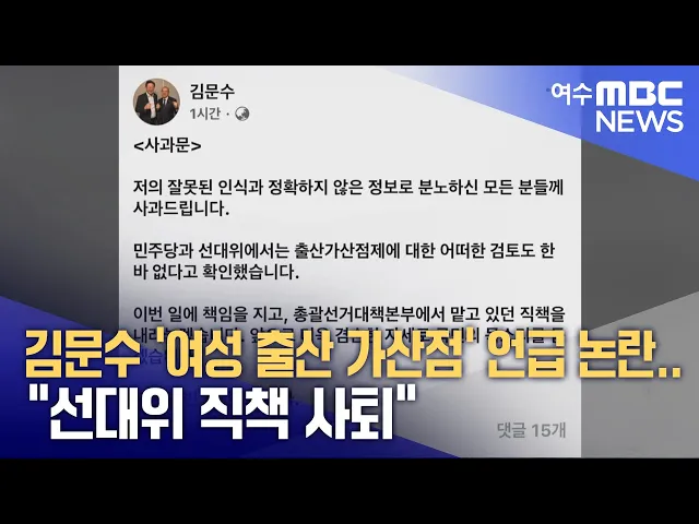 순천의 김문수 국회의원이대선 공약과 관련해'여성 출산 가산점'을 언급하면서논란이 일고 있습니다.김 의원은 최근 한 시민과 나눈 문자 메시지를 통해 "여성은 출산 가산점과 군 가산점 있을 것"이라고 밝혔고, 해당 내용이 온라인 등을 통해 퍼지면서 항의가 잇따르고 있습니다.이에 대해 김 의원은 자신의 SNS를 통해 "...
