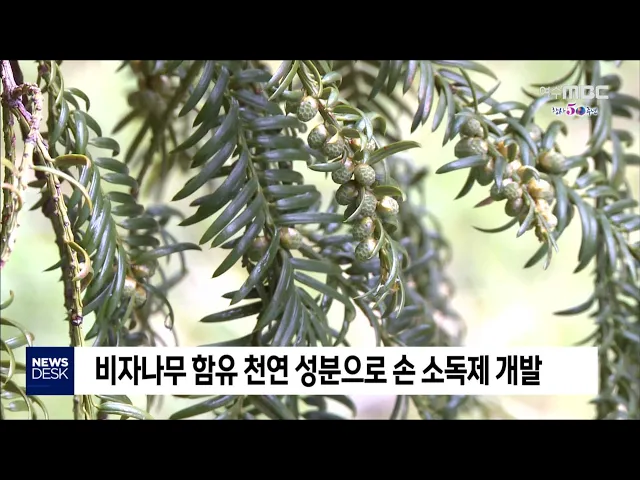 ◀ANC▶최근 전남지역에 분포하고 있는 비자나무의 추출물을 활용한 손 소독제가 개발됐습니다. 코로나19 상황 속에서 전남 난대수종의 새로운 보건·방역 분야 산업화 가능성에도 기대를 모으고 있습니다. 김주희 기자가 보도합니다. ◀END▶◀VCR▶고흥군 포두면 9만7천여㎡면적의 천연기념물 제239호 금탑사 비자나무...