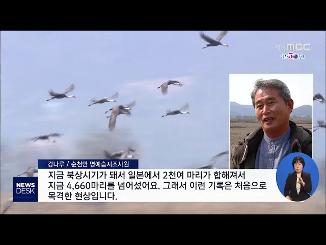 ◀ANC▶천연기념물이자 국제 보호종인 흑두루미 4천 6백여 마리가 순천만에서 목격됐습니다.일본에서 북상하는 흑두루미들이 순천만을 중간기착지로 이용하면서 개체 수가 크게 늘었는데, 야생 흑두루미의 이동루트 추적도 국내에서 처음으로 시도됩니다.박민주기자가 취재했습니다. ◀END▶순천만 농경지,수 천마리의 ...