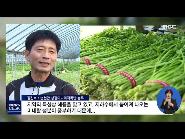 ◀ANC▶ 본격적인 겨울철로 접어들고 있는 요즘, 순천만 일대에서는 미나리 수확이 한창입니다. 청정 지하수로 재배하고 식감과 향까지 뛰어나 전국적인 명성을 이어가고 있습니다. 문형철 기자입니다. ◀VCR▶ 커다란 비닐하우스 안이 온통 초록빛으로 물들었습니다. 물에 잡긴 미나리를 정성스럽게 베어내고, 한쪽에서...