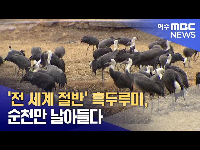 ◀ 앵 커 ▶순천만습지는 멸종위기종흑두루미가 찾는 곳으로,전 세계 개체 수 절반가량이 이번 겨울 날아들었습니다.흑두루미 수가 꾸준히 늘면서국·내외적 관심도 커지고 있습니다.유민호 기자입니다.◀ 리포트 ▶드넓은 들판을 검게 수놓은 철새들.천연기념물이자 멸종위기종인 흑두루미입니다.전 세계 1만6천여 마리가 남아 ...