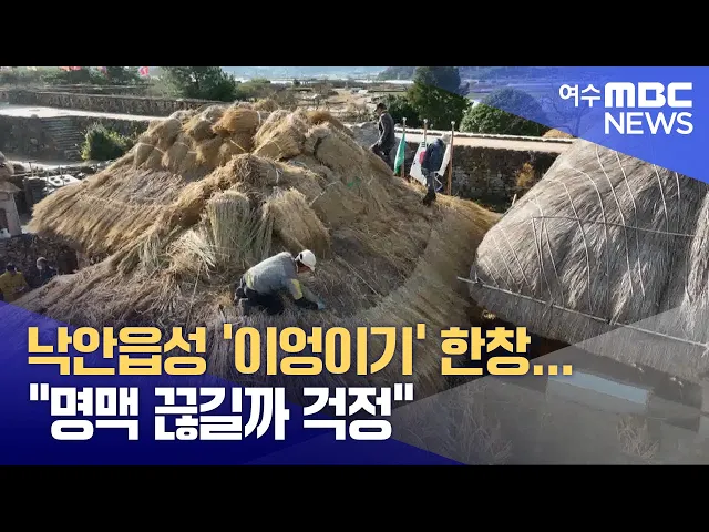 ◀ 앵 커 ▶조선시대의 모습을 간직하고 있는순천 낙안읍성에서는 요즘초가지붕의 볏짚을 교체하는 '이엉이기' 작업이 한창입니다.겨울철에만 볼 수 있는 독특한 전통문화지만,기술을 전수받을 사람이 없어 명맥이 끊기지 않을지 걱정이 크다고 합니다.문형철 기자입니다. ◀ 리포트 ▶집 앞마당에 볏짚을 길게 엮은 이엉이 가...
