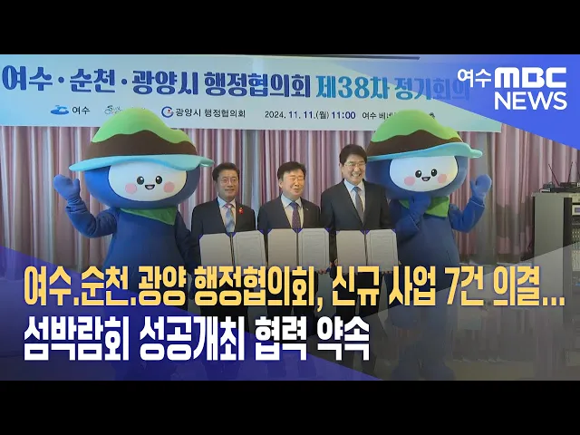여수시와 순천시, 광양시가2026여수세계섬박람회 성공개최 협력과여수공항 취항 항공사 지원 강화 등7건의 신규 사업을 공동 추진하기로 했습니다.정기명, 노관규, 정인화 시장이 참여하는여수.순천.광양시 행정협의회는 오늘(11),여수에서 정기회의를 갖고,7건의 신규 사업과 9건의 연계사업 등, 진행 중인 사업과 신규 안...