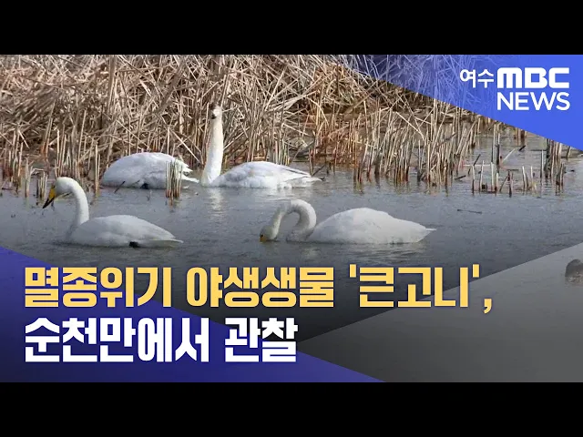 멸종위기 야생생물이자천연기념물 201호인 큰고니가 순천만에서 관찰됐습니다.순천시는 지난 2일 큰고니 두 마리가 순천만을 찾았으며, 지금은 개체수가 14마리까지 늘어났다고 밝혔습니다.순천만에서 월동하는 큰고니는지난 2012년 170여 마리에 달했지만,먹이식물이 줄어들면서 개체수가 감소해 지난 2022년에는 관찰되지...