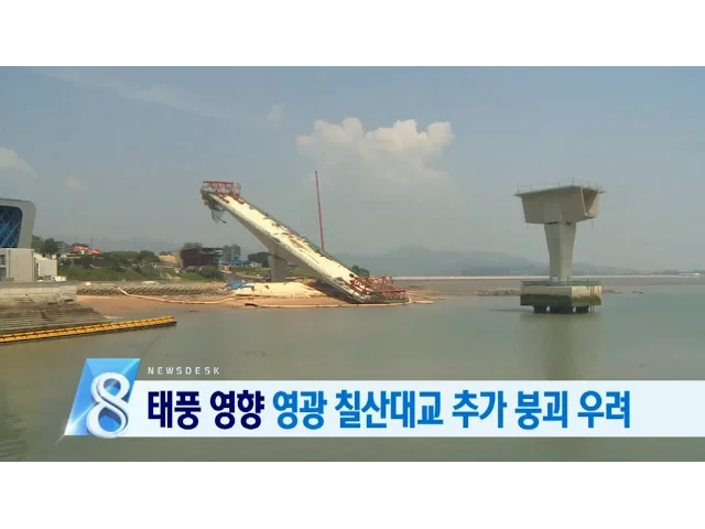 내일(11)부터 남부지역에 태풍 영향에 따른 비바람이 예보된 가운데 영광 칠산대교 사고 현장에서는 추가 붕괴 우려가 제기되고 있습니다.이틀째 현장조사를 벌이고 있는 조사위는 구조물의 형태나 강봉 파손 정도를 고려할 때추가 붕괴 가능성은 적지만, 만일의 사태를 대비해 공사를 전면 중단하고 현장 접근도 통제하고 ...
