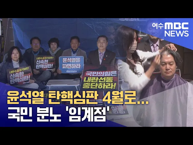 ◀ 앵 커 ▶윤석열 대통령의 탄핵심판 선고일이 결국 4월로 넘어갔습니다.기약 없는 기다림에시민들의 분노와 답답함은 임계점을 넘어서고 있습니다.김단비 기자입니다.◀ 리포트 ▶여수 여서동 로터리에 마련된 천막입니다.더불어민주당 소속 시·도의원과지역위원회 위원들이천막농성에 들어간 지도 2주가 지났습니다.담요와 ...