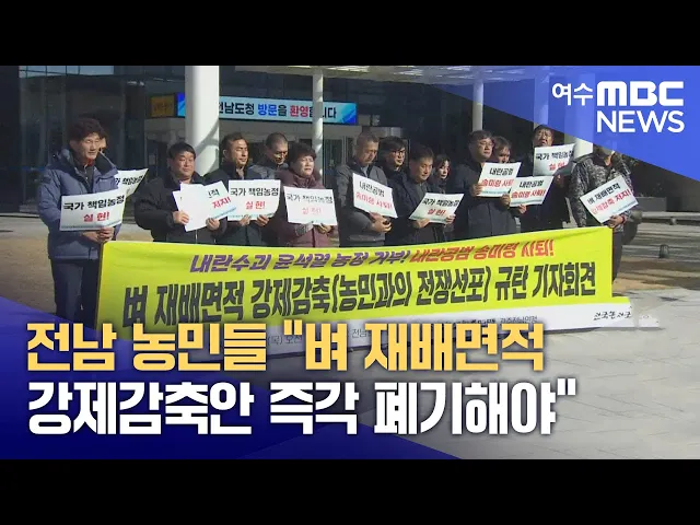 전남 농민들이 8만ha에 달하는 정부의 벼 재배면적 강제 감축안의 즉각 폐기를 촉구하고 나섰습니다.전국농민회총연맹 광주전남연맹 등은 오늘(16) 전남도청 앞에서 기자회견을 열고 재배 감축 면적의 예상 생산량 40만 톤이 수입쌀 양과 같은 것은 우연이 아니라며 전라남도에 농민 영농권을 침해하는 정책을 거부하라고 ...