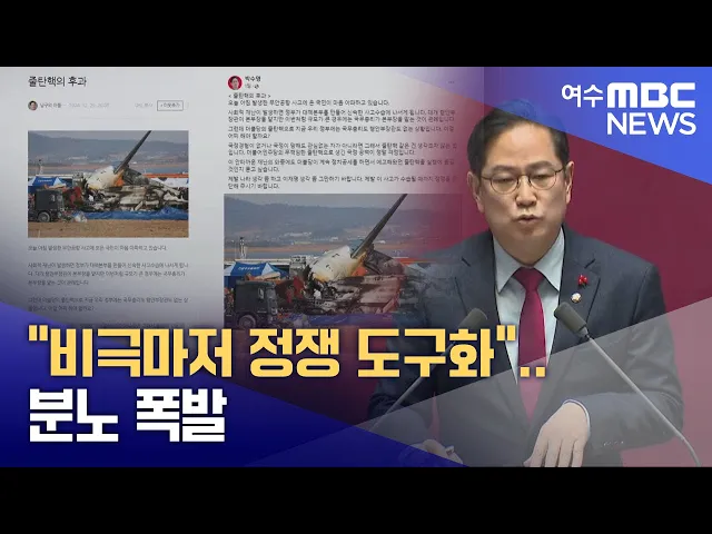 ◀ 앵 커 ▶제주공항 여객기 참사로 온나라가 비탄에빠져 있습니다.그런데 이 상황에서도 애도와 위로를 건네는 대신 참사를 정쟁의 도구로 삼으려는시도가 분노를 사고 있습니다.김진선 기자가 보도. ◀ 리포트 ▶제주항공 여객기 참사가 전해진 날.국민의힘 박수영 의원이 SNS에 올린 글입니다.[통CG] 사고 사진과 함께 "민주...