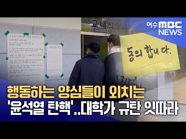 ◀ 앵 커 ▶윤석열 대통령의 탄핵을 촉구하는 목소리가전남의 대학가에서도 번지고 있습니다.대학생들은 민주주의를 지키기 위해'행동하는 양심'을 따르겠다고 외치고 있습니다.안준호 기자가 취재했습니다.◀ 리포트 ▶초당대학교 학생회관 앞에 붙은 대자보.'비상식을 넘어 몰상식이 도래한 지금,안녕들 하십니까'를 제목으로...
