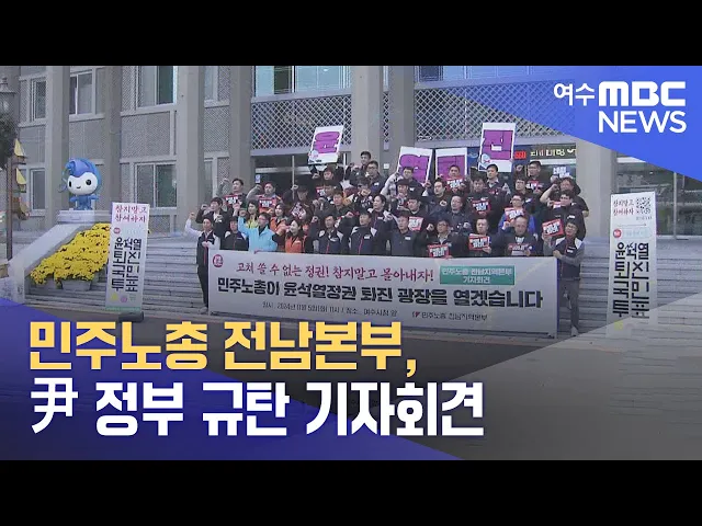 민주노총 전남지역본부가오늘(5) 여수시청 앞에서 윤석열 정권의 퇴진을 촉구했습니다.민노총 전남지역본부는 이날 기자회견에서 윤석열 정권이 헌법에 보장된 노동기본권을 무시하고노조를 범죄 집단으로 매도했다고 규탄했습니다.민노총은 오는 9일 전국노동자대회와 총궐기를 통해 정권 퇴진 여론을 형성하겠다며 내달 ...