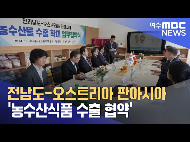 전라남도가,오스트리아 판아시아 본사에서전남지역 농·수산식품 -수출 확대를 위한업무협약을 체결했습니다.판아시아는 유럽의 아시아 식품 유통1위 기업으로 이번 협약에 따라앞으로 5년동안 3천만 달러 규모의전남 우수 농수산식품을 유럽시장으로수입할 예정입니다.전남지역 농수산식품 수출액은올해 들어 5억 7천523만 ...