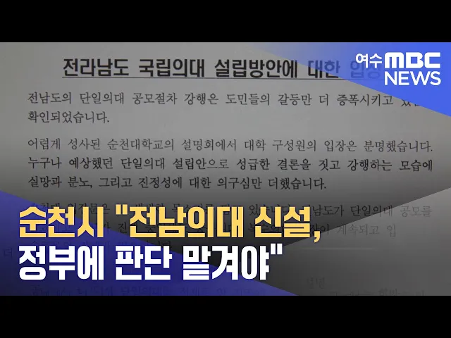 순천시가 내일(12) 예정인전남도의 의대설립방식 발표를 두고의대 신설은 정부가 결정해야 한다고 주장했습니다.순천시는 입장문을 내고전남도의 단일의대 공모 강행은도민 갈등만 증폭시켰다며대통령이 의대 신설을 결심할 수 있게김영록 전남지사가 리더십을발휘해야 한다며 이같이 밝혔습니다.이어 현재 극심한 의정갈등...