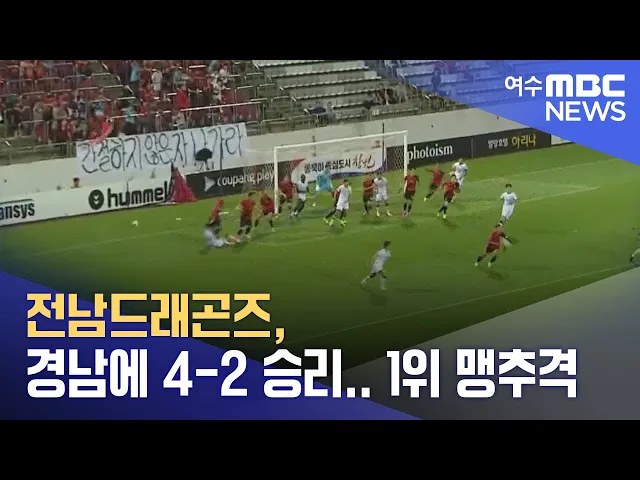 프로축구 전남드래곤즈가 경남FC와의 원정 경기에서 이기면서선두를 맹추격하고 있습니다.전남은 어제(1) 창원축구센터에서 치러진원정 경기에서최원철과 임찬울, 하남과 발디비아의 득점으로경남FC를 4 대 2로 이겼습니다.9경기 연속 무패 행진을 이어가고 있는 전남은 현재 2위로1위인 FC안양과 승점 5점 차이입니다.한편...