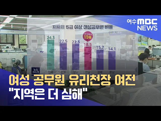 ◀ANC▶ 지방 공무원 가운데 여성의 비율이 갈수록 높아지고 있다는 통계가 나왔습니다. 하지만 관리자 급으로 갈수록 '남성 우위'현상은 여전해서 아직도 유리천장이 건재하다는 지적이 많은데요. 시군 단위 조직으로 내려올수록, 특히 우리지역의 경우 상황은 더 심하다고 합니다. 박광수 기자가 보도합니다. ◀END▶ ...