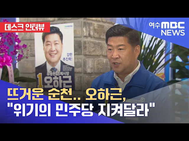 ◀ANC▶ 이번 선거 벌써 종반으로 치닫고 있습니다. 사전 투표도 이틀 앞으로 다가왔는데요. 여수MBC 데스크 인터뷰에서는, 가장 치열한 혼전을 벌이고 있는 순천시장 선거전의 양 강 후보를 차례로 만나봤습니다. 오늘은 ‘젊은 경제시장’의 브랜드로 더불어민주당 공천장을 거머쥔 오하근 후보를 만나 핵심 정책과 선거종...