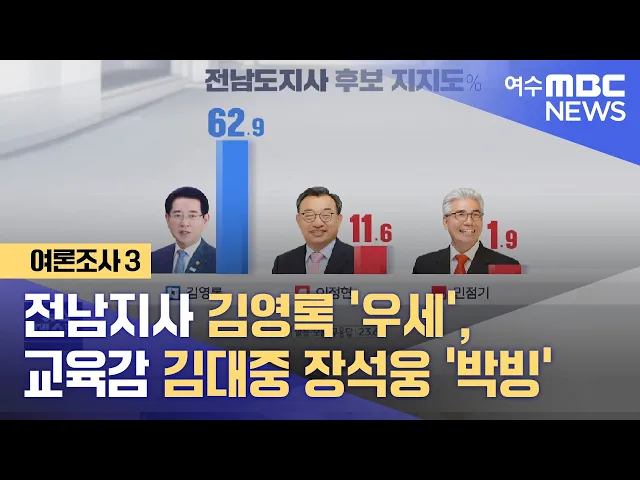 ◀ANC▶ 6˙1 지방선거를 앞두고 저희 여수MBC가 실시한 여론조사 결과, 전남지사 선거는 더불어민주당 김영록 후보가 우세입니다. 전남교육감 선거는 김대중, 장석웅 후보가 초박빙 경합 양상입니다. 김주희 기자가 보도합니다. ◀END▶ ◀VCR▶ 더불어민주당 김영록, 국민의힘 이정현, 진보당 민점기 등 모두 3명의 후...