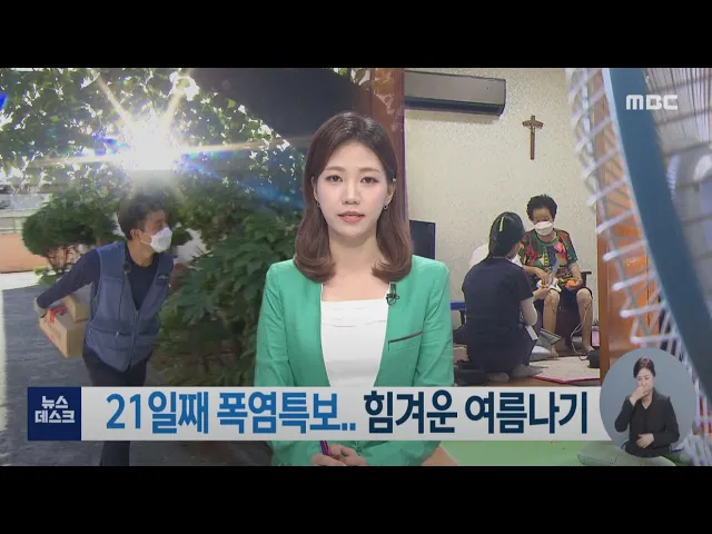 ◀ANC▶오늘(27)까지 전남지역은 21일째 폭염특보가 이어지고 있습니다.야외에서 일하는 택배노동자나온열질환 위험에 놓인 취약계층들은어느때보다 힘겨운 여름을 나고 있습니다.강서영 기자입니다. ◀VCR▶전국에 폭염특보가 내린 무더운 한낮.택배기사 육동주씨가 에어컨을 등에 지고 5층 아파트 계단을 오릅니다.육 ...