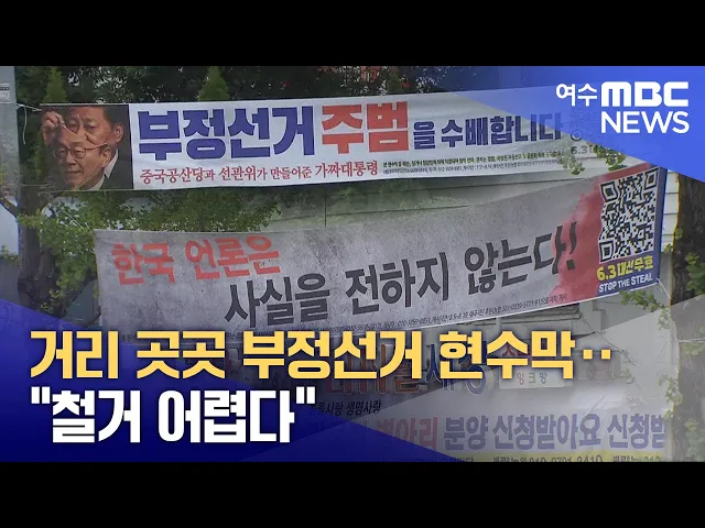 ◀ 앵 커 ▶요즘 거리 곳곳에서부정선거, 대선무효 등이 적힌정당 현수막 많이 보셨을 텐데요.내용에 불편함을 느끼는 시민이 늘고철거 민원이 폭주하고 있지만,지자체는 조치가 어렵다는 입장입니다.유민호 기자입니다.◀ 리포트 ▶오거리에 걸린 현수막입니다.한국 언론은 사실을 전하지 않는다.6·3 대선은 무효라는 문구도 ...