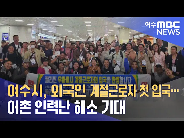 여수시가 어촌 인력난 해소를 위해 올해 처음 도입한 외국인 계절근로자 51명이 최근 부산 김해공항을 통해 입국했습니다.여수시는 올해 필리핀 계절근로자 129명을 관내 굴 양식어가 등에 내년 3월까지 5개월간 투입할 계획이며,어제(22), 51명이 처음으로 입국한 데 이어이달 안에 나머지 인원도순차적으로 입국할 예정이...