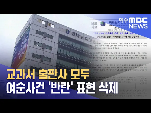 여순사건을 '반란'으로 표현한고등학교 한국사 교과서 5종 모두, 이를 수정하거나삭제한 것으로 확인됐습니다.전남교육청은 해당 출판사에 '반란', '반군' 표현 등을삭제하라고 촉구한 결과출판사 5곳이 수정·삭제했고이 가운데 4곳은사과문을 보내왔다고 밝혔습니다.전남교육청은 앞으로 학생들이 올바른 역사 의식을 가질...