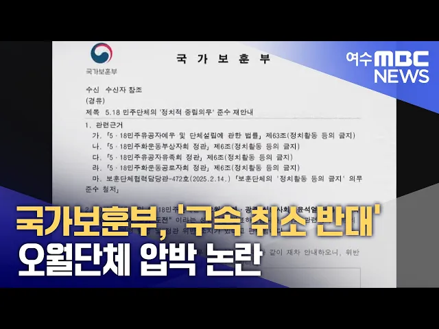 윤석열 대통령 구속 취소를 반대하는 성명서를 낸 오월단체들에게 국가보훈부가 압박성 공문을 보내 논란이 일고 있습니다.5.18 공법 3단체 등에 따르면 국가보훈부는 오월단체가 '윤 대통령 구속 취소 반대' 성명서를 발표하자, 어젯밤(7) 정치적 중립을 준수하라는 공문을 보냈습니다.5.18 단체 관계자들은 "내란죄 혐의...