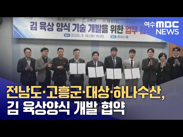 전라남도와 고흥군, 대상과 하나수산이김 육상양식 기술 개발을 위한 업무협약을 맺었습니다.4개 기관은 컨소시엄을 구축하고,김 육상양식 기술 공동 개발을 통해김 산업을 친환경 성장 산업으로 육성하기로 약속했습니다.고흥군은 2023년 김 육상양식 시범사업을 통해육상에서 물김을 판매할 수 있는 크기인40~50cm까지 키...