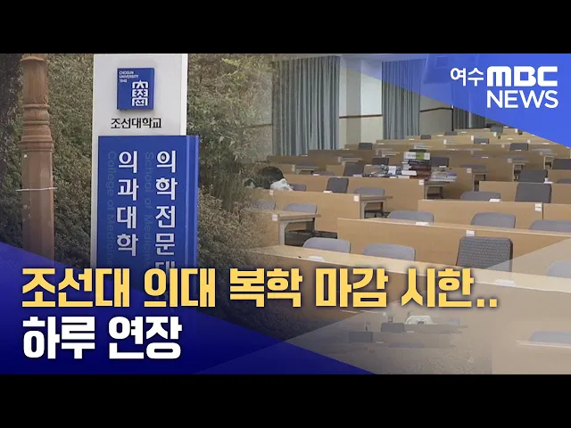 ◀ 앵 커 ▶요즘 의정갈등으로 학교를 떠났던지역 의대생들의 복학 여부가 관심사죠조선대 의대는 의대생 복귀를 위해복학 신청 마감을 하루 더 늦췄고,이미 제적 절차에 들어갔던 전남대 의대 경우엔복학 가능성이 아직 열려 있습니다.보도에 김영창 기자입니다.◀ 리포트 ▶조선대 의대가 의대생 복귀 마감 시한을 내일(28)까...