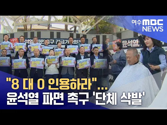 ◀ 앵 커 ▶윤석열 대통령의 탄핵 심판 선고를 앞두고 인용을 촉구하는 목소리가거세지고 있습니다.전남지역 기초·광역 의원들은 민주주의를 바로 세워야 한다며단체 삭발을 감행했습니다.박종호 기잡니다.◀ 리포트 ▶흰 가운을 두른 의원들 사이로미용사들이 등장합니다.해남진도완도 지역구인전남도의원과 군의원 등 21명이 ...