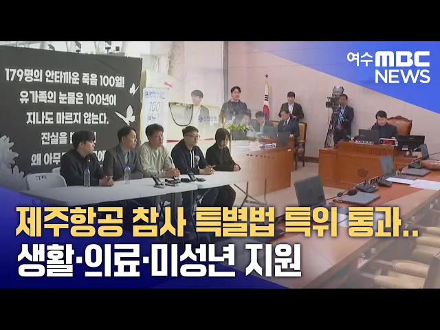 ◀ 앵 커 ▶1229 제주항공 여객기 참사 100일을 맞아 진상 규명과 피해자 지원 등 내용을 담은특별법이 국회 특위를 통과했습니다.유족들의 생활과 의료 지원 그리고 참사로 부모를 잃은 미성년자를 보호하기 위한내용이 포함됐습니다.박종호 기자가 보도합니다.◀ 리포트 ▶1229 여객기 참사 특별 법안이 국회 특위를통과했습...