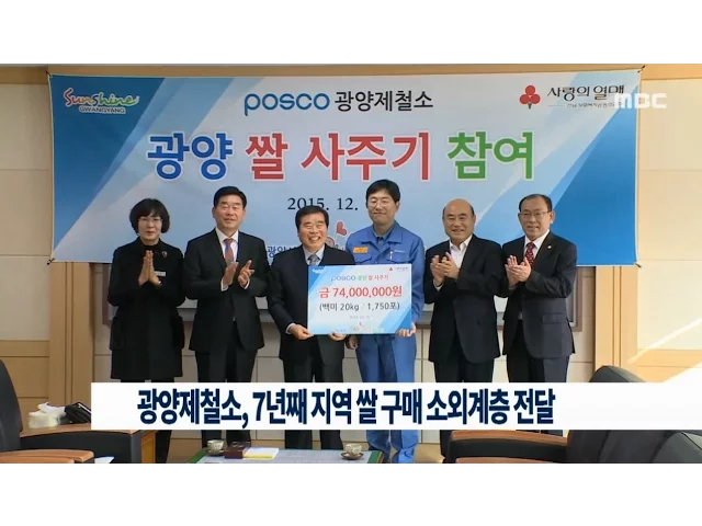 포스코 광양제철소 7년 째 지역 농민과 소외계층을 위한 쌀을 구매해 지역과 기업 상생의 귀감이 되고 있습니다.포스코 광양제철소는 올해 쌀농사 대풍과 쌀 소비량 감소로 어려움을 겪고 있는 지역 농가를 돕기 위해 7000만원 상당의 20㎏들이 지역 쌀 1760포대를 구입해지역의 소외계층 1760세대에 전달했습니다.광양제철...