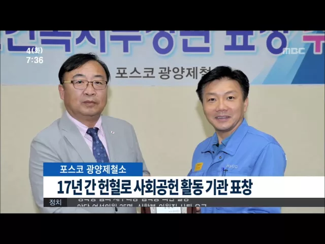 포스코 광양제철소가 지속적인 헌혈로 사회 공헌 활동을 펼쳐온데 대해 공로를 인정받아 보건복지부로부터 기관 표창을 수여받았습니다.포스코 광양제철소는 매월 셋째 주 목요일 '포스코패밀리 사랑나눔 헌혈행사'를 진행하고 있으며 지난 17년 동안 헌혈에 참여한 임직원들만 연 인원 2만여명에 이르고 있습니다.
