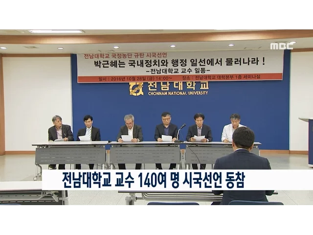 대학가와 시민사회에서 전국적으로 시국선언이 이어지고 있는 가운데 전남대학교 교수들도 시국선언에 동참했습니다.전남대 최영태 교수 등 141명은 기자회견을 열고 "대통령이 국민이 위임한 주권을 최순실을 비롯한 소수의 개인에게 양도했다"며"대통령은 정치와 행정 일선에서 물러나고국회가 거국내각구성에 합의해야한...