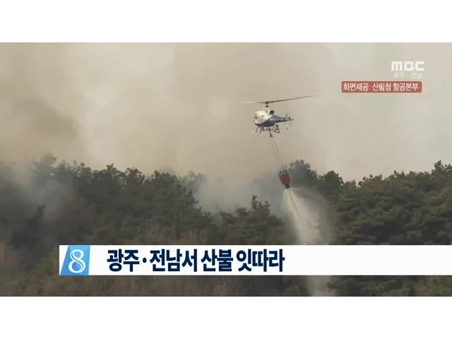오늘 하루 광주·전남에서산불이 잇따랐습니다.오늘(2) 오후 2시쯤,담양군 수북면의 한 야산에서 불이 나임야 0.1ha를 태우고 2시간 반만에 꺼졌습니다.이에 앞서 낮 12시쯤에는광주시 동구 산수동의 한 야산에서 불이 나임야 0.005ha가 불에 탔고,비슷한 시각 무안군 몽탄면의 한 야산에서도 화재가 발생해임야 0.3헥타르를...