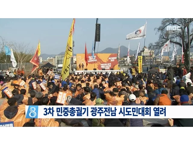 3차 민중총궐기 문화제와 집회가 오늘 오후 광주 5.18 민주광장을 비롯해 서울 광화문광장 등 전국 12개 지역에서 열렸습니다. 광주시 동구 5.18 민주광장 앞에서는 광주와 전남에서 경찰 추산 2천여명이 모여 문화제 행사를 가진 뒤 광장을 출발해 새누리당사 앞을 거쳐 광주역까지 2개 차로로 행진했습니다. 집회 참여...