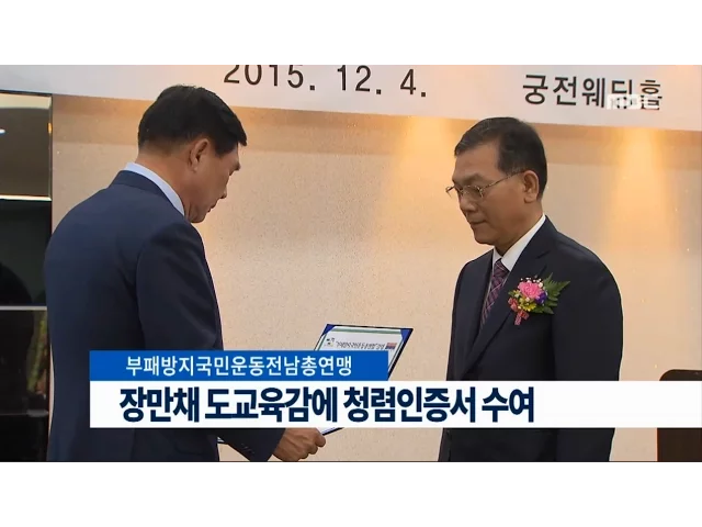 장만채 전라남도 교육감이청렴인 인증서를 받았습니다.'부패방지 국민운동 전남총연맹'은 오늘(4)도내 22개 시군 지회장이 참석한 가운데순천에서 발대식을 갖고,장만채 전남도교육감에게청렴인 인증서를 전달했습니다.오늘 출범한 전남총연맹은각 기관.단체의 부패방지를 위해 노력하고청렴 문화 확산을 위해지속적으로 ...