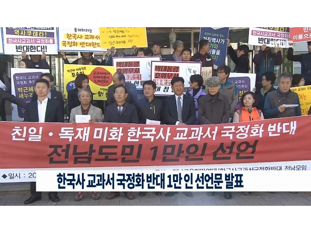 전남지역 교육·시민단체가오늘(30) 순천시청 앞에서 기자회견을 열고한국사 교과서 국정화에 반대하는전남도민 1만인 선언문을 발표했습니다.전남교육희망연대와한국사 교과서 국정화 반대 전남도민 모임은이 자리에서 "한국사 교과서 국정화 정책은 친일과 독재를 미화하고 헌법을 부정하는 역사 쿠데타"라고 비판하며"국...