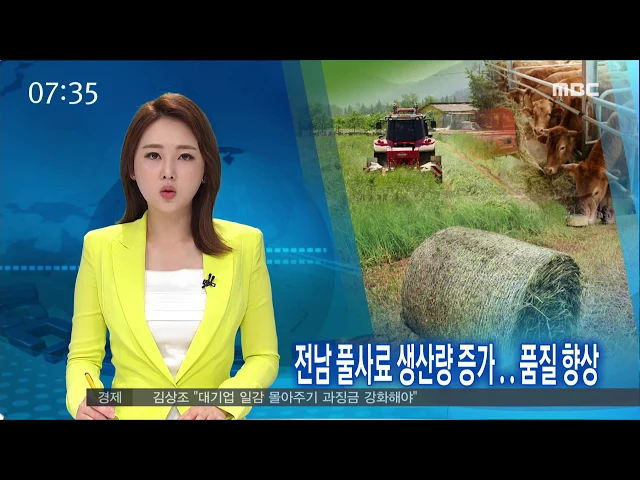 ◀ANC▶ 한우 사육농가에게 풀사료는 고기의 품질을 결정하는 중요한 보조사료 입니다. 요즘 남도에서는 모내기를 앞두고 풀사료 수확이 한창인데, 예년보다 품질이 좋아 수확의 기쁨도 크다고 합니다. 신광하 기자 입니다. ◀VCR▶ 대형 트랙터에 매달린 사료수확기가 건초들을 한데 모아 둥글게 ...