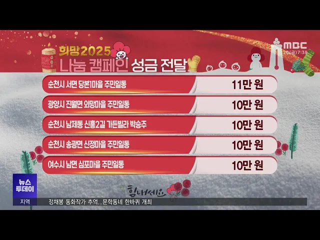 # 뉴스투데이계속해서 희망 2025 나눔 캠페인에 성금 보내주신 분들입니다////////////////여수시 돌산읍 계동마을 주민일동 509,000 원 순천시 덕연동 2통 주민일동 287,000 원순천시 중앙동 9통 주민일동 270,000 원(사)순천시자원봉사센터 따따시봉사단\t241,000 원여수시 남면 장지마을 주민일동 200,000 원///////////...
