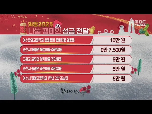 # 뉴스데스크계속해서 희망 2025 나눔 캠페인에 성금 보내주신 분들입니다////////////////여수시 중앙동 14통 조영식 외 주민일동 530,000 원여수시 중앙동 12통장 전창길\t 500,000 원고흥군 동일면 동포마을 주민일동 410,000 원여수시립쌍봉어린이집 원아,학부모 및 교직원일동 304,000 원고흥군 도화면 화옥마을 주민...