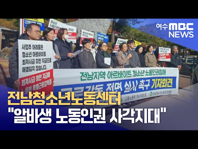 아르바이트 청소년들의 노동 인권에 대한 근로 감독이 필요하다는 주장이 나옵니다.오늘(3) 전남청소년노동인권센터는여수고용노동지청 앞에서 기자회견을 열고,아르바이트 근로기준법 위반 사업장을 전수 조사하고, 근로 감독을 실시하라고 촉구했습니다.이들은 또, 아르바이트 청소년의 대부분이사업주와 근로계약서를 체...