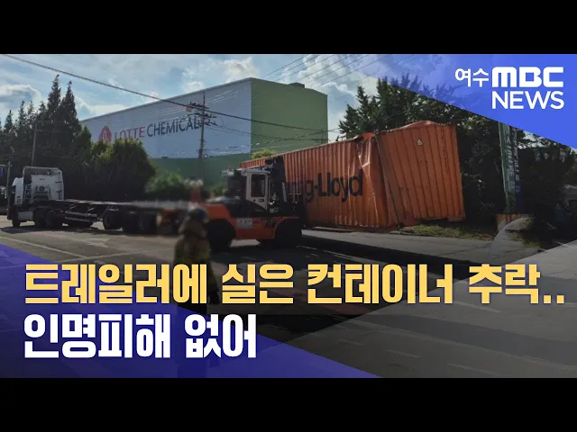 오늘(12) 오후 4시쯤여수산단의 한 도로를 달리던 대형 트레일러가 컨테이너를 떨어뜨렸습니다.이 사고로 다친 사람은 없었지만, 20분가량 한 차선이 통제되며 운행에 차질이 빚어지기도 했습니다.경찰은 컨테이너 상부가 철길에 부딪혀추락한 것으로 보고, 정확한 사고 원인을 조사하고 있습니다.
