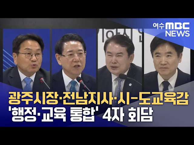 전라남도와 광주시, 전남도교육청과 광주시교육청이 오늘(14) 4자 회담을 갖고 행정·교육 통합을 위한 공동 대응에 나서기로 했습니다.이들 기관은 합의문을 통해 가칭 '광주·전남특별시' 설치를 위한 특별법이2월 내에 국회를 통과할 수 있도록 긴밀히 협력하고, 공감대 확산을 위한 공청회를 지역별로 개최하기로 했습니다.또, 통합 과정에서 27개 시·군·구의 정체성과 교육자치를 보장하고,통합 이전에 임용된 공무원은 기존 관할구역 내에서 근무하는 내용도합의 내용에 포함됐습니다.