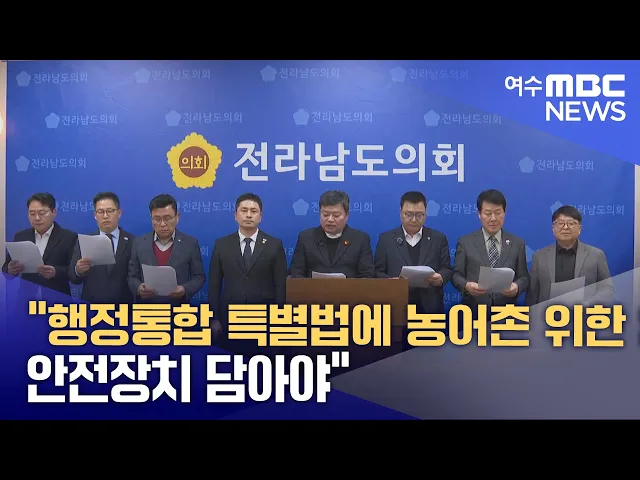 광주·전남 행정통합 특별법에농어촌 재정과 인구 대응을 위한 안전장치를담아야 한다는 주장이 나왔습니다.정영균, 최동익, 임형석 전남도의원은오늘(19) 기자회견을 열고,특별시 출범 이후에도 별도의 제도적 장치가 없다면도농복합시 읍·면지역은 통합의 효과를 체감하지 못한 채소멸 위기로 내몰릴 수 있다고 우려했습니다.이어 제도적 대안으로행정통합 특별법에도농복합시 읍·면 특별회계 특례와 인구감소 지역 지정 등법적 근거 마련을 제안했습니다.