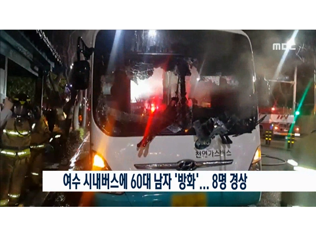 오늘 오후 6시 30분 쯤 여수시청 앞 도로에서승객을 태우기 위해 정차한 시내버스에 신원을 알 수 없는 60대 남자가 승차해 휘발유를 뿌린 뒤 불을 질러 차량이 전소됐습니다.버스가 화염에 휩싸이자 승객들은대부분 긴급히 하차해 대피했지만 8명이 연기 흡입 등으로 인근 병원으로 옮겨져 치료를 받았습니다. 경찰은 방...