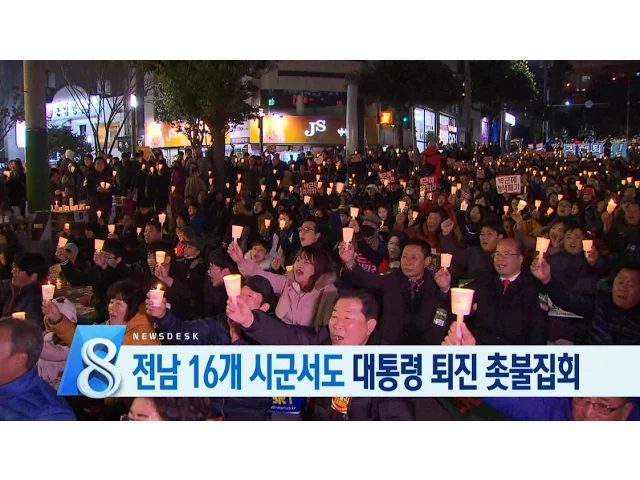 ◀ANC▶주말마다 대통령 퇴진을 요구하는 촛불이 타오르는 건 전남에서도 이제 당연한 일이 되고 있습니다.대통령 탄핵안 처리를 놓고 머뭇거린 야권을 향한 비판도 쏟아지고 있습니다.양현승 기자입니다. ◀END▶ ◀VCR▶땅거미가 지자 어김없이 시민들은 촛불을 들고 광장에 모였습니...