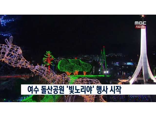 여수 돌산공원을 화려한 조명으로 장식하는 '빛노리야' 행사가 오늘(1) 시작됐습니다. 이번 행사는 내년 2월까지 진행되며, 점등시간은 평일은 오후 6시부터 자정까지,주말과 공휴일은 오후 6시부터 새벽 1시까지입니다. 여수시는 올해 말 여수 거북공원에도화려한 LED 조명을 설치해 관광객들을 맞이할 계획입니다.
