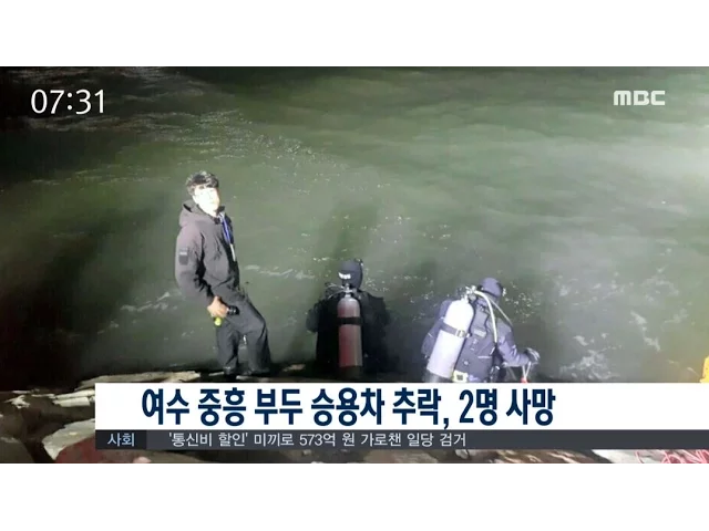 어제(27) 오후 6시 10분쯤여수시 중흥동 여수화력발전소 앞 바다에승용차가 추락해이 모 씨 등 남성 2명이 숨졌습니다.해경은2시간여 동안 구조작업을 벌였지만탑승자 모두 숨진 채 발견됐다며자세한 사고경위를 조사하고 있습니다.