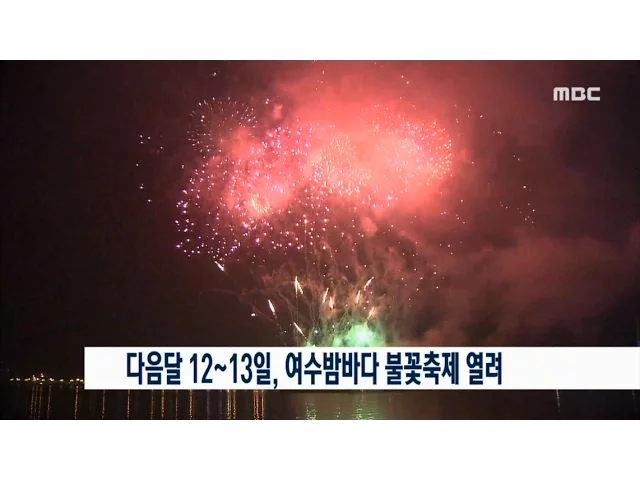 다음달 12일과 13일, 여수 장군도 주변에서여수밤바다 불꽃축제가 화려하게 펼쳐집니다.여수의 낭만이라는 주제로 열리는 이번 불꽃축제는 이순신광장과 장군도사이 해상에 바지선을 띄워 11가지 주제 음악에 맞춰 레이저와 불꽃이 밤바다를 물들여,관광객과 시민들을 매료시킬 전망입니다.12일 첫날은 이탈리아팀이 저녁 9...