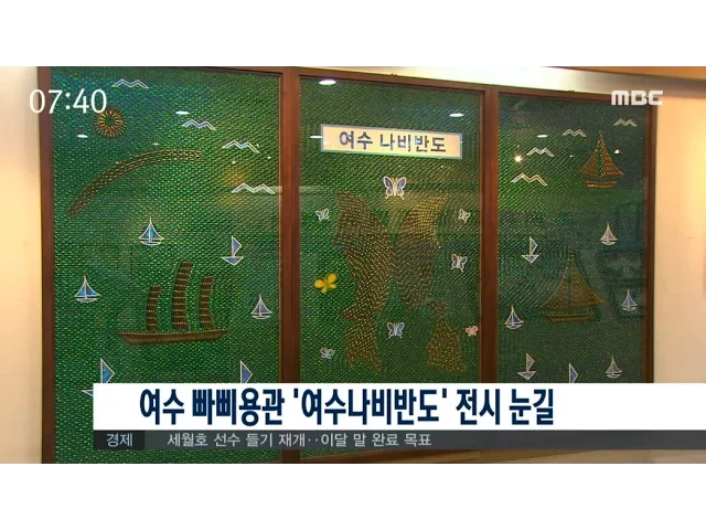여수 자산공원 내 빠삐용관에 비단벌레로 만든 작품인 여수나비반도가 전시돼눈길을 끌고 있습니다.이번에 전시 공개된 여수나비반도는초록물고기라고 불리는 비단벌레 딱지날개 2만여 개를 레이저 커팅과 채색, 접합 과정을 거쳐10개월동안 제작한 작품이며,일련의 재료와 과정, 작품은 특허청에 상표 등록로 추진되고 있...