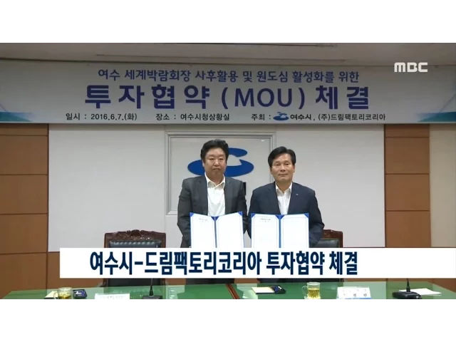 여수시가 민간투자업체와박람회장 사후활용을 통한원도심 활성화를 위해 투자협약을 체결합니다.여수시는 오늘백20억원대 규모로박람회장 주제관을 미래 체험관으로 운영하고빅오 일대에 청년 창업길을 조성하는박람회장 사후활용 투자협약을 체결했습니다.드림팩토리코리아는이번 협약을 통해 2학기부터 자유학기제 학생들...